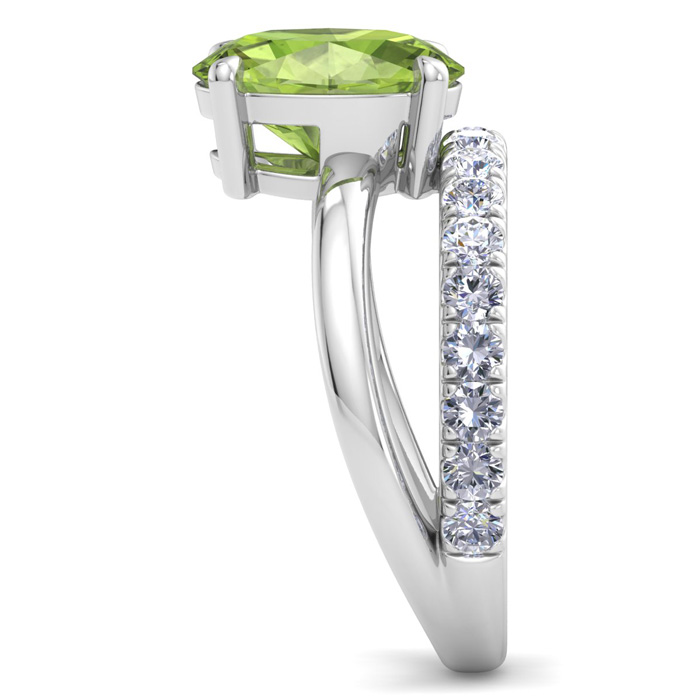 This elegant gemstone ring features one 10x8mm oval shape peridot gemstone at approximately 2 1/2 carats. It is surrounded by 18 sparkling diamonds in I-J color, I1-I2 clarity at 1/2 carat total weight. Total gem weight is approximately 3 carats. This ring is in 14 karat white gold.