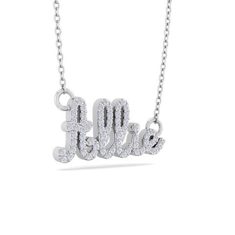 This amazing diamond name necklace is personalized for you! Wear your name, your child's name, your pet's name - the sky is the limit! This name necklace is meant for 5 letters. It contains approximately 61 diamonds in I-J color, I1-I2 clarity at approximately 1/3 carat total diamond weight. This necklace is in 14 karat white gold. This necklace comes with a 16 inch cable chain with a spring-ring clasp.