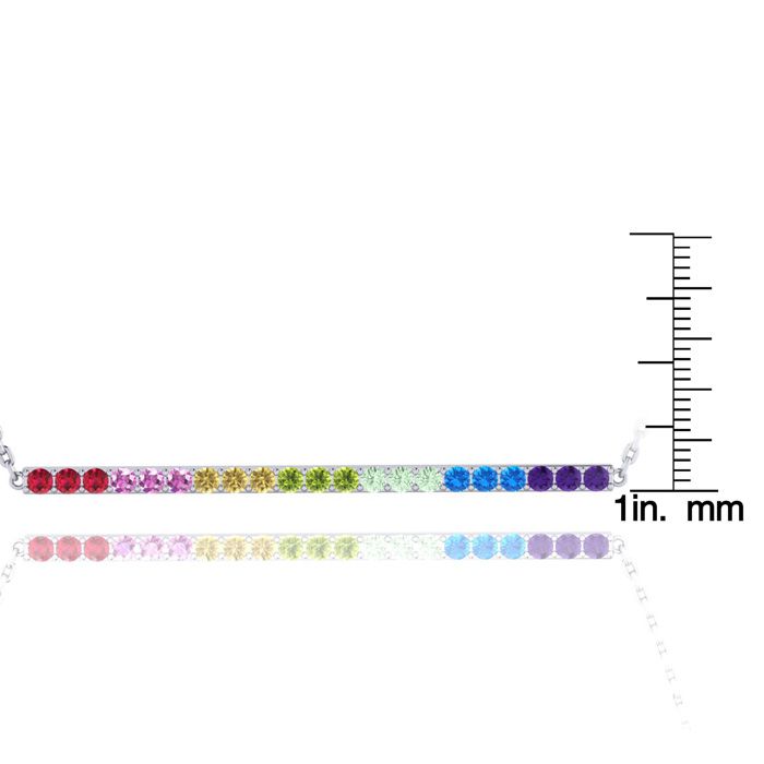 This gemstone rainbow bar necklace features 21 various gemstones. There are three each of genuine ruby, created pink topaz, citrine, peridot, green amethyst, blue topaz and amethyst gemstones. Total carat weight is 1 1/2 carats. The bar itself measures about 2 inches long and 2.5mm wide. This necklace comes with an 18 inch 14 karat white gold cable chain with a spring ring clasp.