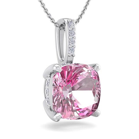 This elegant gemstone and diamond necklace features one 6mm cushion cut pink topaz gemstone at approximately 1.15 carats. It is accented with 15 sparkling diamonds in I-J color, I1-I2 clarity at 0.04 carats total. Total gem weight is approximately 1 1/5 carats. This necklace is in 14 karat white gold. This necklace comes with an 18 inch cable chain with a spring-ring clasp.