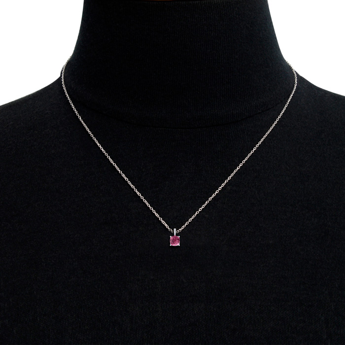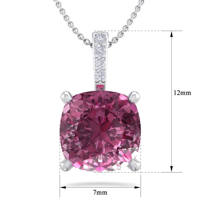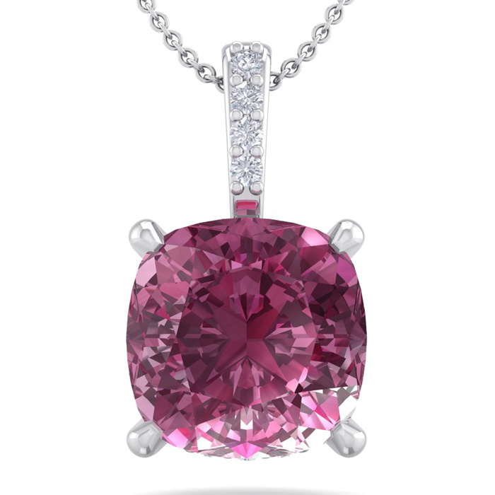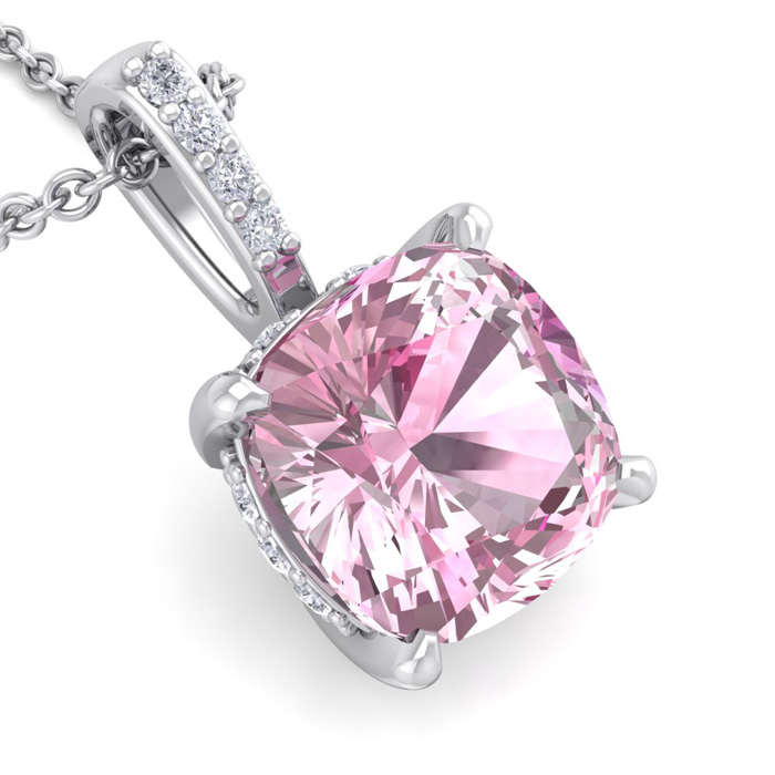 This elegant gemstone and diamond necklace features one 6mm cushion cut pink topaz gemstone at approximately 1.15 carats. It is accented with 15 sparkling diamonds in I-J color, I1-I2 clarity at 0.04 carats total. Total gem weight is approximately 1 1/5 carats. This necklace is in 14 karat white gold. This necklace comes with an 18 inch cable chain with a spring-ring clasp.