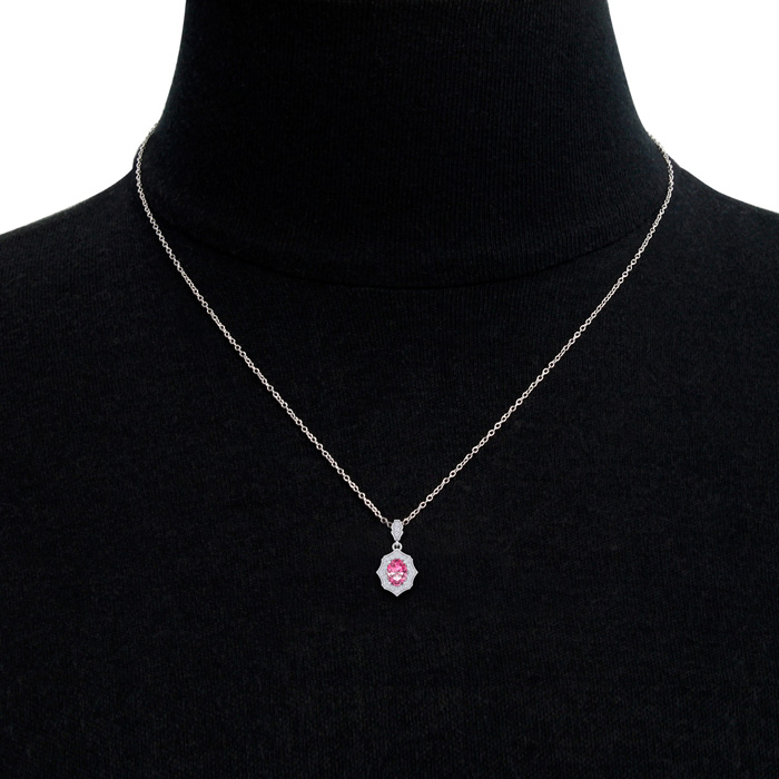This elegant gemstone necklace features one 8x6mm oval shape pink topaz gemstone at approximately 1 1/2 carats. It is surrounded by 23 sparkling diamonds in I-J color, I1-I2 clarity at 1/4 carat total weight. Total gem weight is approximately 1 3/4 carat total weight. This necklace is in 14 karat white gold and comes with an 18 inch cable chain with a spring ring clasp. The pendant is approximately 3/4 inch long.