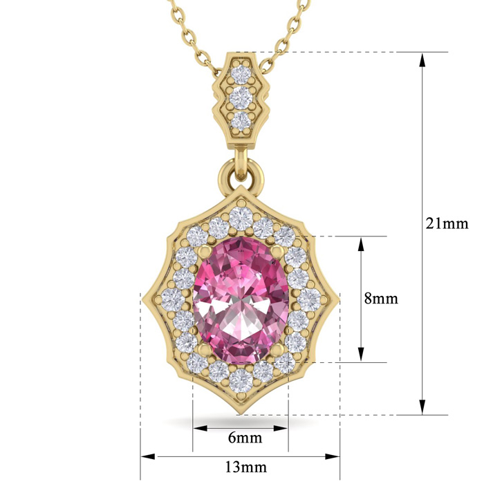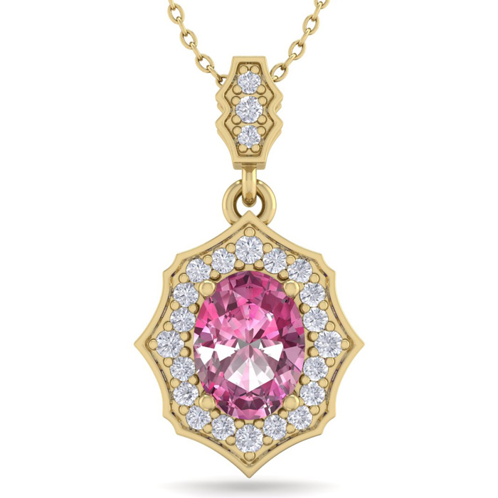 This elegant gemstone necklace features one 8x6mm oval shape pink topaz gemstone at approximately 1 1/2 carats. It is surrounded by 23 sparkling diamonds in I-J color, I1-I2 clarity at 1/4 carat total weight. Total gem weight is approximately 1 3/4 carat total weight. This necklace is in 14 karat yellow gold and comes with an 18 inch cable chain with a spring ring clasp. The pendant is approximately 3/4 inch long.