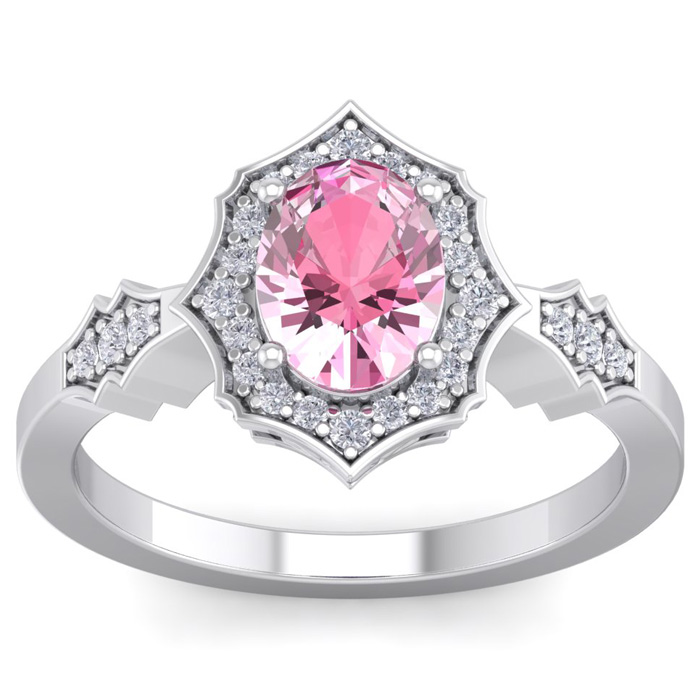 This elegant gemstone ring features one 8x6mm oval shape pink topaz gemstone at approximately 1 1/2 carats. It is surrounded by 26 sparkling diamonds in I-J color, I1-I2 clarity at 1/4 carat total weight. Total gem weight is approximately 1 3/4 carat total weight. This ring is in 14 karat white gold.