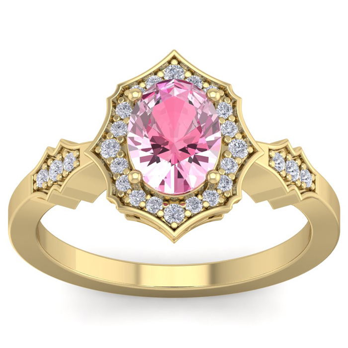 This elegant gemstone ring features one 8x6mm oval shape pink topaz gemstone at approximately 1 1/2 carats. It is surrounded by 26 sparkling diamonds in I-J color, I1-I2 clarity at 1/4 carat total weight. Total gem weight is approximately 1 3/4 carat total weight. This ring is in 14 karat yellow gold.