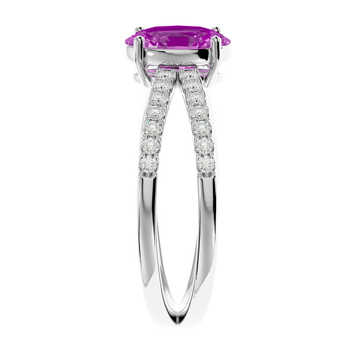 This elegant gemstone ring features one 8x6mm oval shape pink topaz gemstone at approximately 1 1/2 carats. It is surrounded by 28 sparkling diamonds in I-J color, I1-I2 clarity at 1/4 carat total weight. Total gem weight is approximately 1 3/4 carats. This ring is in 14 karat yellow gold.