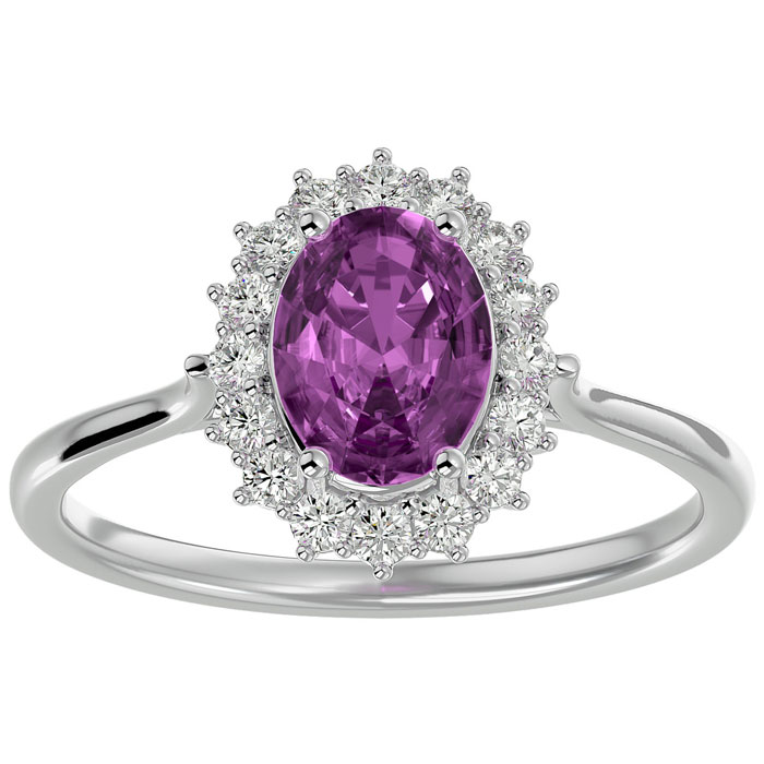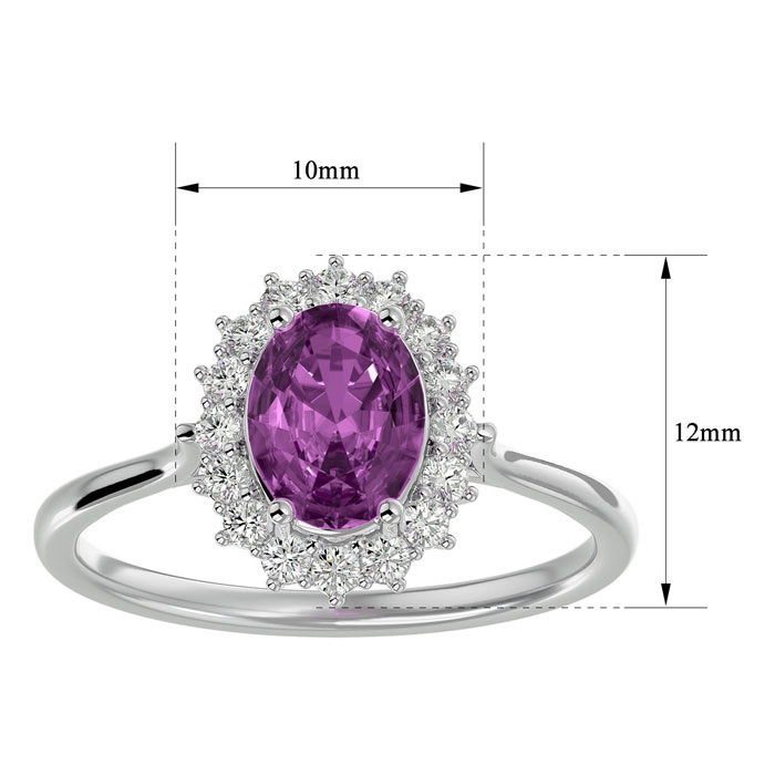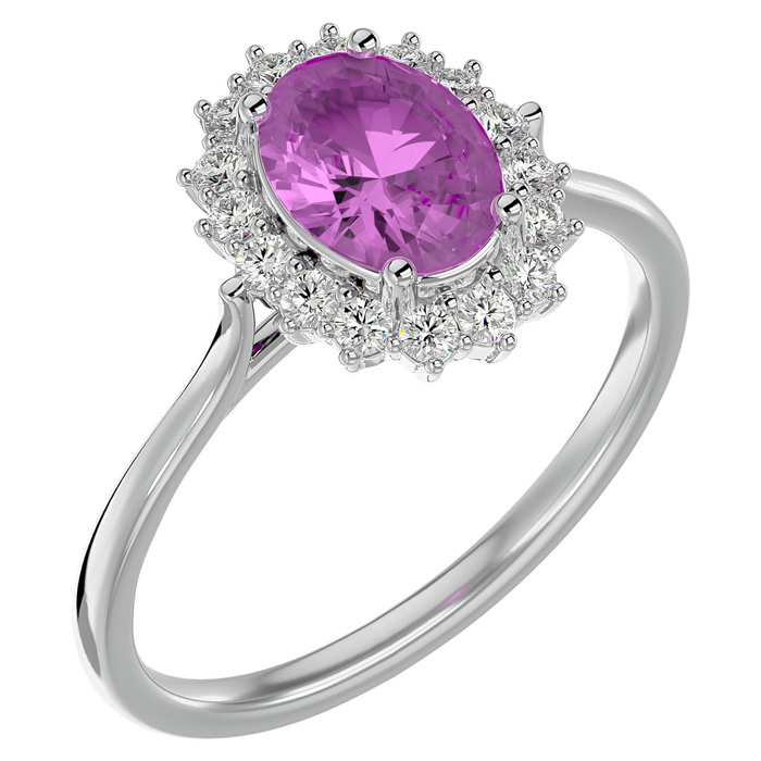 This elegant gemstone ring features one 8x6mm oval shape pink topaz gemstone at approximately 1 1/2 carats. It is surrounded by 16 sparkling diamonds in I-J color, I1-I2 clarity at 1/4 carat total weight. Total gem weight is approximately 1 3/4 carats. This ring is in 14 karat white gold.