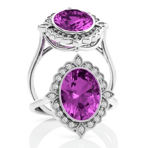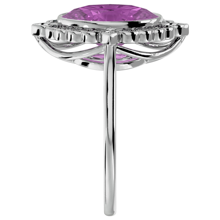 This elegant gemstone ring features one 8x6mm oval shape pink topaz gemstone at approximately 1 1/2 carats. It is surrounded by 20 sparkling diamonds in I-J color, I1-I2 clarity at 1/5 carat total weight. Total gem weight is approximately 1 3/4 carats. This ring is in 14 karat white gold.