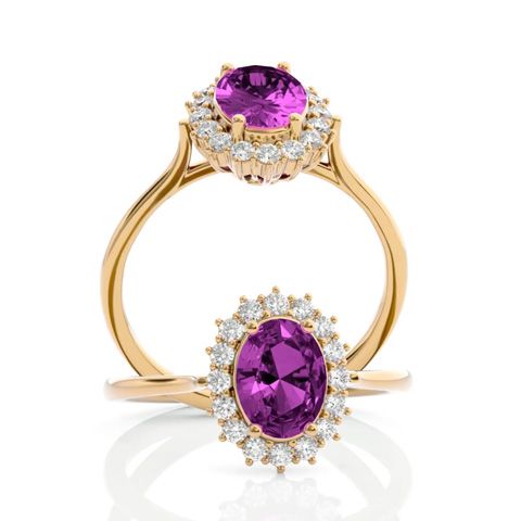 This elegant gemstone ring features one 8x6mm oval shape pink topaz gemstone at approximately 1 1/2 carats. It is surrounded by 16 sparkling diamonds in I-J color, I1-I2 clarity at 1/4 carat total weight. Total gem weight is approximately 1 3/4 carats. This ring is in 14 karat yellow gold.
