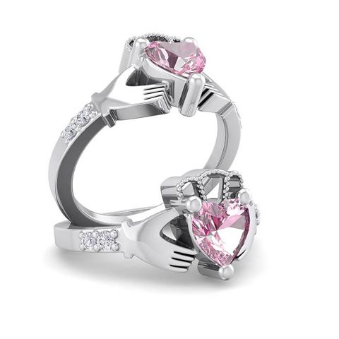 1 Carat Heart Shape Pink Topaz and Diamond Claddagh Ring In 14 Karat White Gold