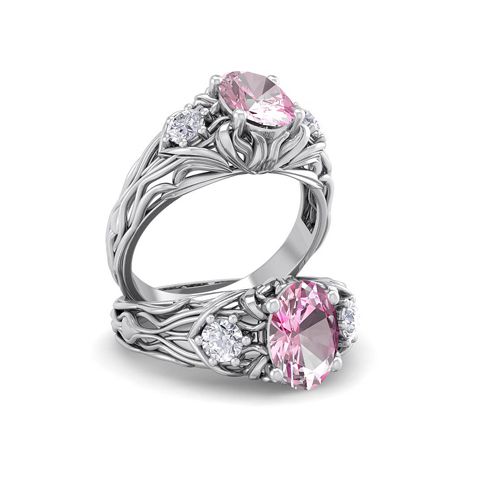1 Carat Oval Shape Pink Topaz and Diamond Intricate Vine Engagement Ring In 14 Karat White Gold