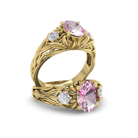 1 Carat Oval Shape Pink Topaz and Diamond Intricate Vine Engagement Ring In 14 Karat Yellow Gold