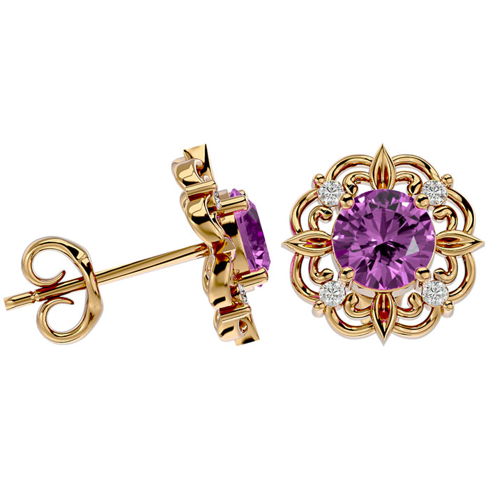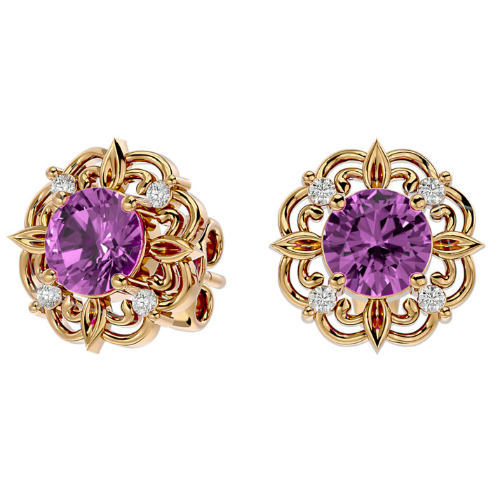 These elegant gemstone earrings feature two 6mm pink topaz gemstones at approximately 2 carats. They are surrounded by 8 sparkling diamonds in I-J color, I1-I2 clarity at 1/10 carat total weight. Total gem weight is approximately 2 1/10 carats. These earrings are in 14 karat yellow gold and have comfortable and secure friction backs.