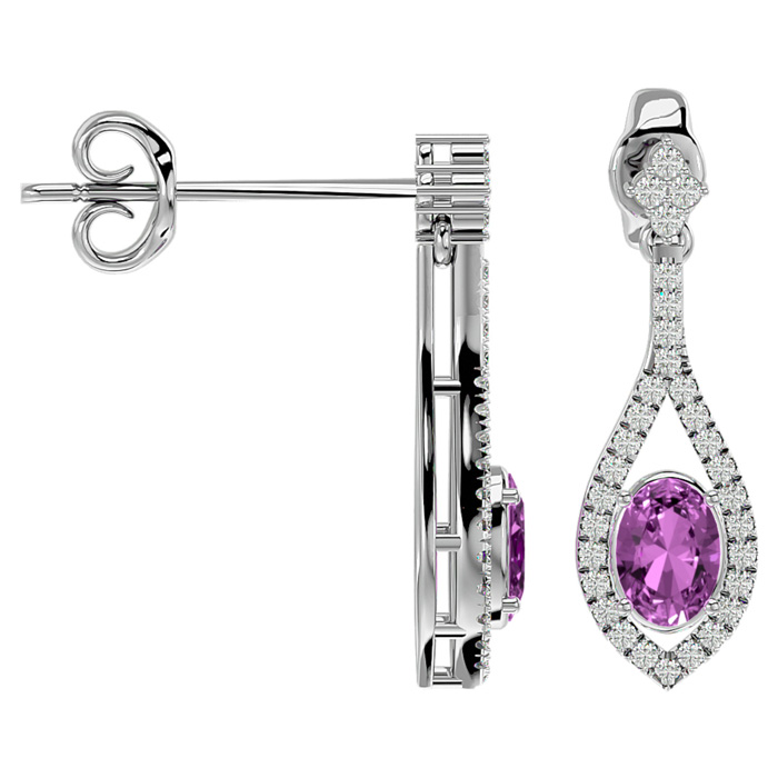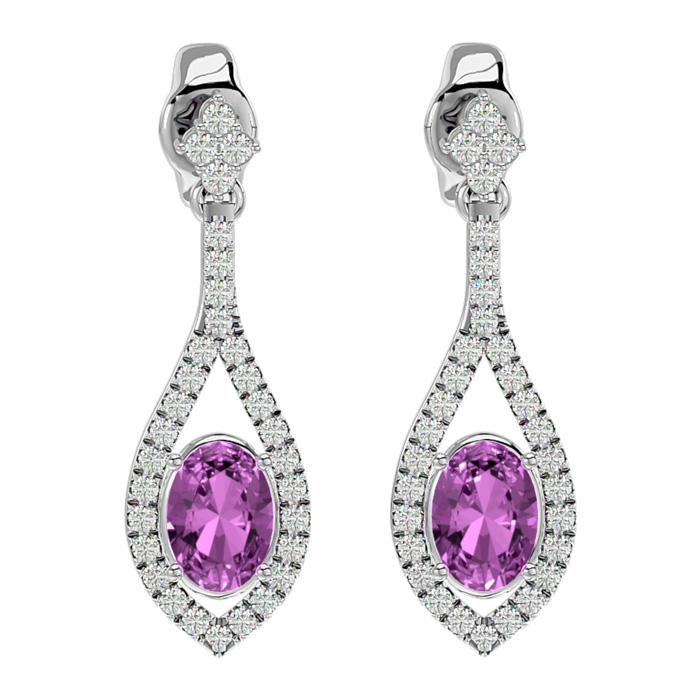 These elegant gemstone earrings feature two 7x5mm oval shape pink topaz gemstones at approximately 2 carats. They are surrounded by 62 sparkling diamonds in I-J color, I1-I2 clarity at 1/2 carat total weight. Total gem weight is approximately 2 1/2 carat total weight. These earrings are in 14 karat white gold and have comfortable and secure friction backs. Each earring dangles down 1 inch.
