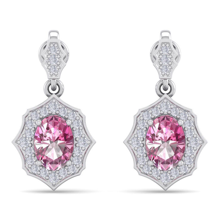 Retrograde Birthstones™ 2 1/4 Carat Oval Shape Pink Topaz and Diamond Dangle Earrings In 14 Karat White Gold