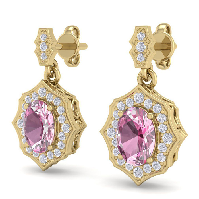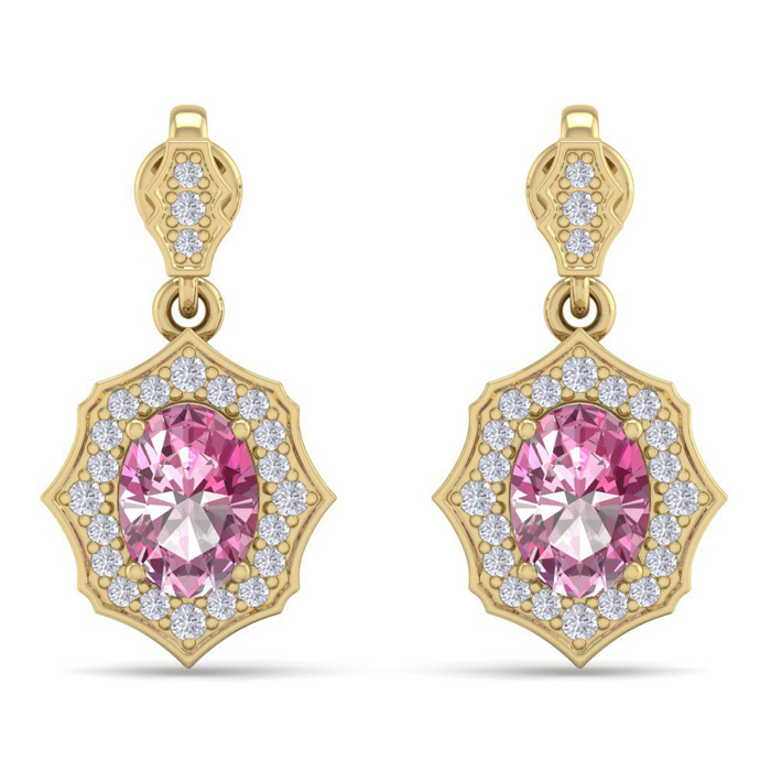 Retrograde Birthstones™ 2 1/4 Carat Oval Shape Pink Topaz and Diamond Dangle Earrings In 14 Karat Yellow Gold