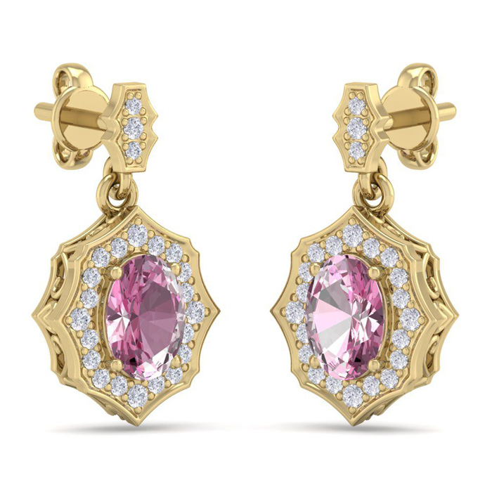 These elegant gemstone earrings feature two 7x5mm oval shape pink topaz gemstones at approximately 2 carats. They are surrounded by 46 sparkling diamonds in I-J color, I1-I2 clarity at 1/4 carat total weight. Total gem weight is approximately 2 1/4 carat total weight. These earrings are in 14 karat yellow gold and have comfortable and secure friction backs. Each earring dangles down 3/4 inch. *Retrograde Birthstones™ flips the idea of traditional birthstones. Wear your ½ birthday birthstone, your Retrograde Birthstone, “The Birthstone For Your Bad Side™.