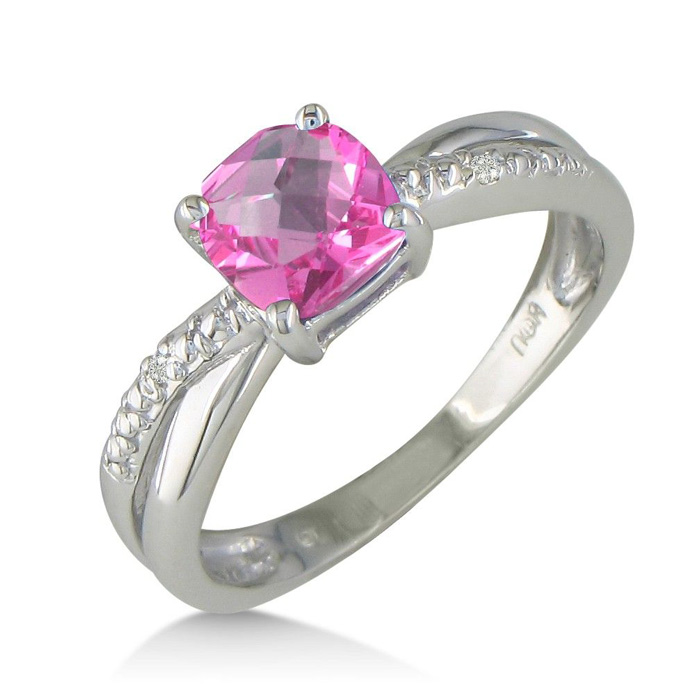 10 karat white gold cushion cut pink topaz and diamond ring with a total gem weight of 3/4 carats. Diamond content is .01ct in I-J color I2 clarity.