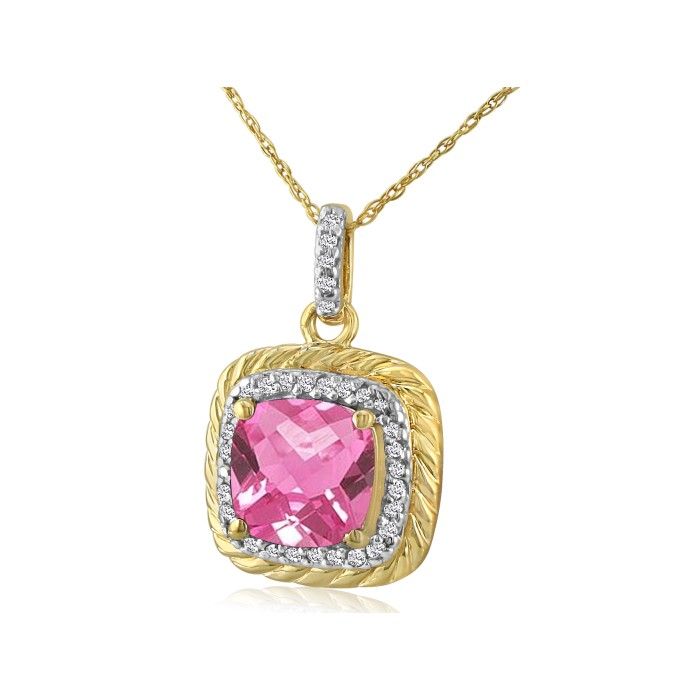 Intelligent and simplified is exactly describes this 2.16ct Pink Topaz and Diamond pendant! The cushion cut, beautiful pink topaz is paired with 33 of SuperJeweler's quality round diamonds, I-J Color, and I2 Clarity. It even comes with a complementary 18-inch chain.
