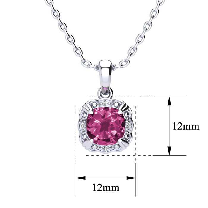 This stunning pink sapphire necklace features one 8x8mm cushion shape created pink sapphire gemstone weighing approximately 2 carats. It is surrounded by 4 sparkling diamonds in I-J color, I1-I2 clarity at 0.04 carats. This necklace is crafted in sterling silver and comes with an 18 inch cable chain with spring ring clasp.