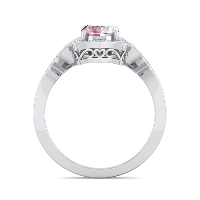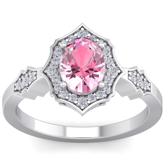 This pink sapphire ring features one 8x6mm oval shape created pink sapphire gemstone. It is surrounded by 26 sparkling diamonds totaling 1/4 carat in I-J color, I1-I2 clarity. Total carat weight is approximately 1 1/2 carats. This ring is in sterling silver.