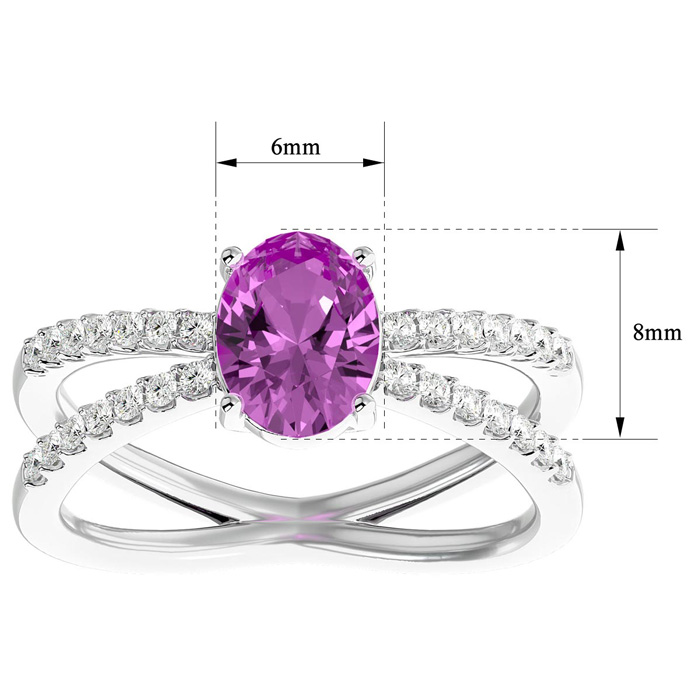 This pink sapphire ring features one 8x6mm oval shape created pink sapphire gemstone. It is surrounded by 28 sparkling diamonds totaling 1/4 carat in I-J color, I1-I2 clarity. Total carat weight is approximately 1 1/2 carats. This ring is in sterling silver.