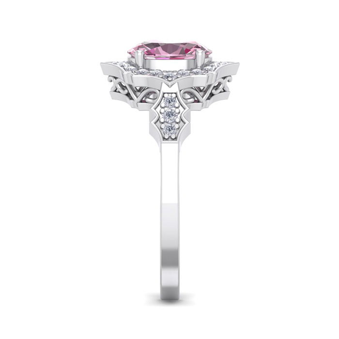 This pink sapphire ring features one 8x6mm oval shape created pink sapphire gemstone. It is surrounded by 26 sparkling diamonds totaling 1/4 carat in I-J color, I1-I2 clarity. Total carat weight is approximately 1 1/2 carats. This ring is in sterling silver. *Retrograde Birthstones™ flips the idea of traditional birthstones. Wear your ½ birthday birthstone, your Retrograde Birthstone, “The Birthstone For Your Bad Side™.