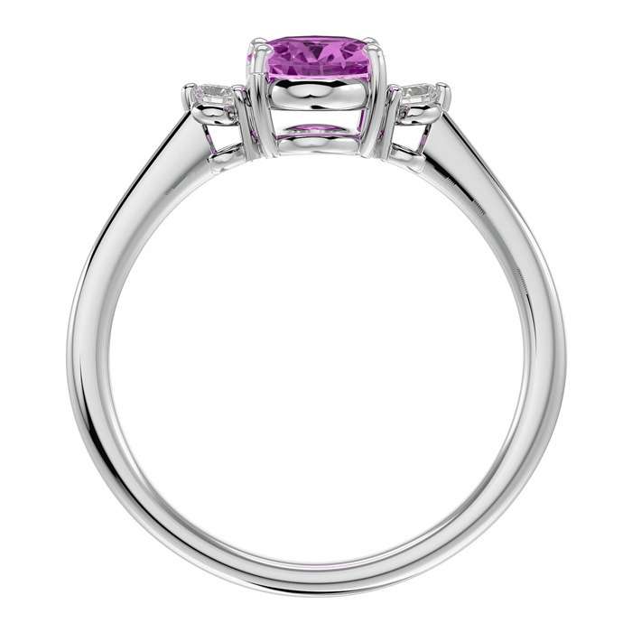 This pink sapphire ring features one 8x6mm oval shape created pink sapphire gemstone. It is surrounded by two sparkling diamonds totaling 1/10 carat in I-J color, I1-I2 clarity. Total carat weight is approximately 1 1/3 carats. This ring is in sterling silver.