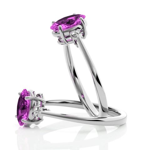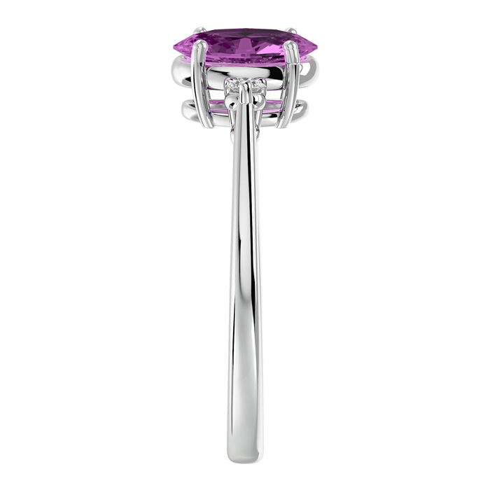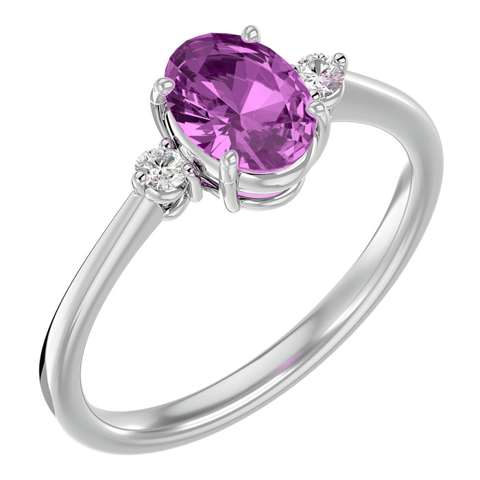 This pink sapphire ring features one 8x6mm oval shape created pink sapphire gemstone. It is surrounded by two sparkling diamonds totaling 1/10 carat in I-J color, I1-I2 clarity. Total carat weight is approximately 1 1/3 carats. This ring is in sterling silver.