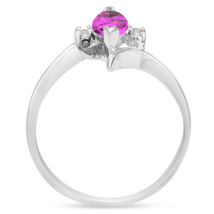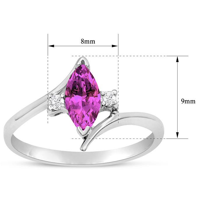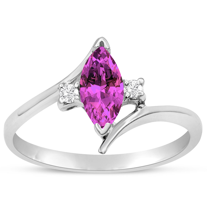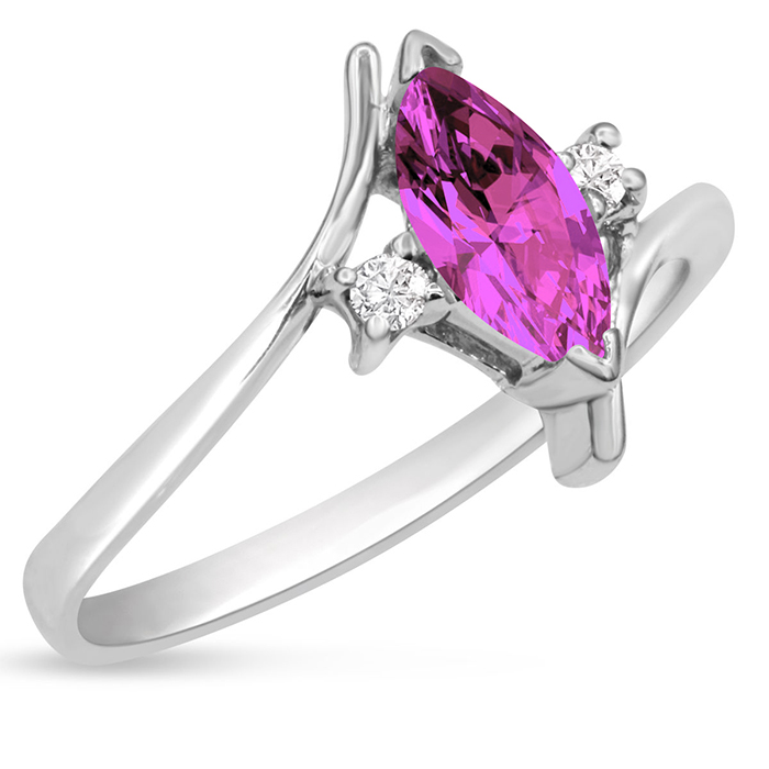This pink sapphire ring features one 8x4mm marquise shape created pink sapphire gemstone. It is surrounded by 2 sparkling diamonds totaling 0.05 carats in I-J color, I1-I2 clarity. Total carat weight is approximately 1/2 carat. This ring is in sterling silver.