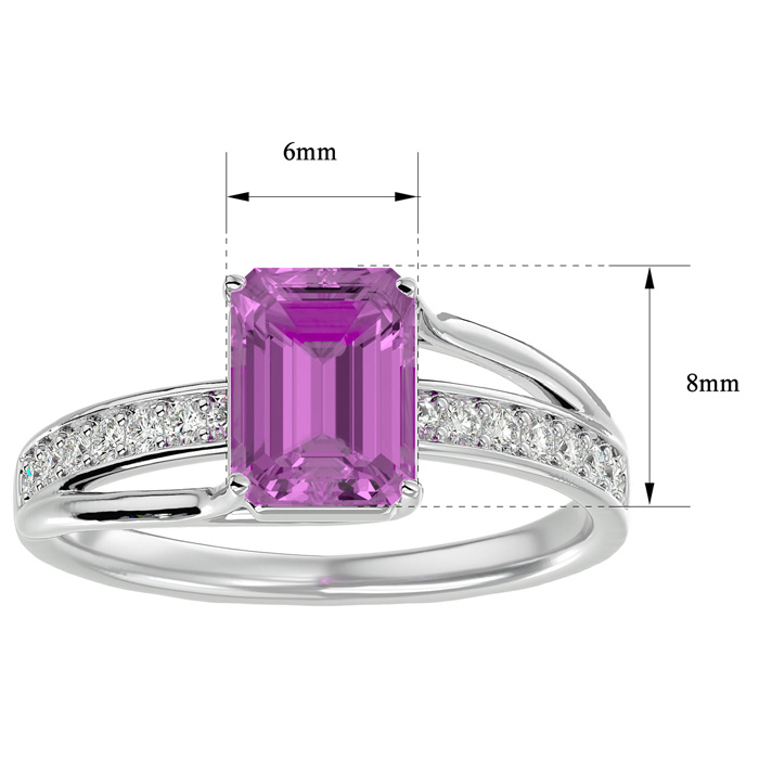 This pink sapphire ring features one 8x6mm emerald shape created pink sapphire gemstone. It is surrounded by 14 sparkling diamonds totaling 1/5 carat in I-J color, I1-I2 clarity. Total carat weight is approximately 1 3/4 carats. This ring is in sterling silver.