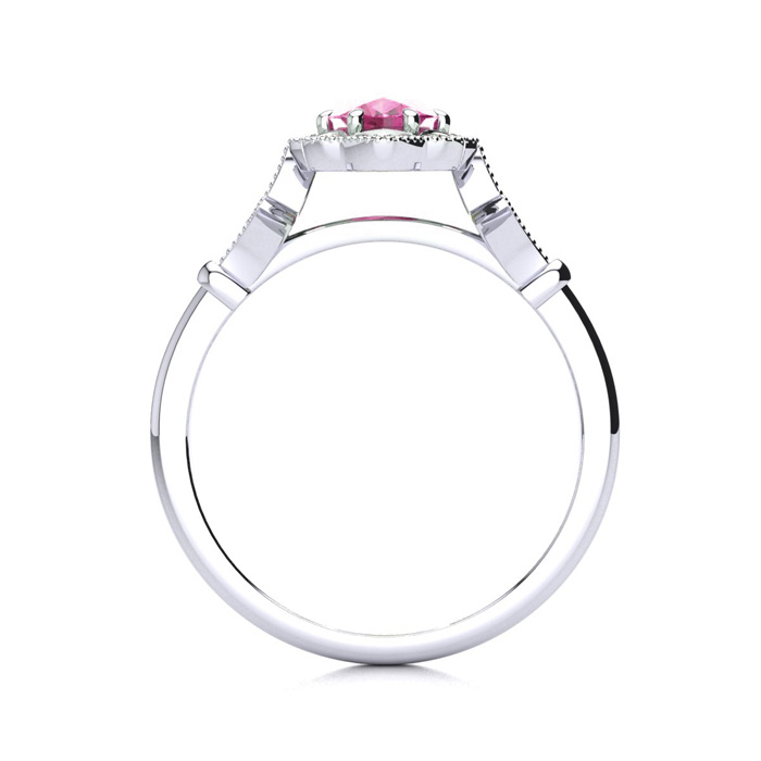 This pink sapphire ring features one 7x5mm oval shape created pink sapphire gemstone. It is surrounded by 10 sparkling diamonds totaling 0.13 carats in I-J color, I1-I2 clarity. Total carat weight is approximately 1 carat. This ring is in sterling silver.