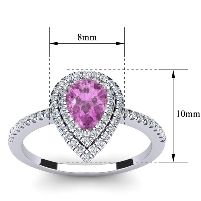 This pink sapphire ring features one 7x5mm pear shape created pink sapphire gemstone. It is surrounded by 62 sparkling diamonds totaling 1/3 carat in I-J color, I1-I2 clarity. Total carat weight is approximately 1 carat. This ring is in sterling silver.