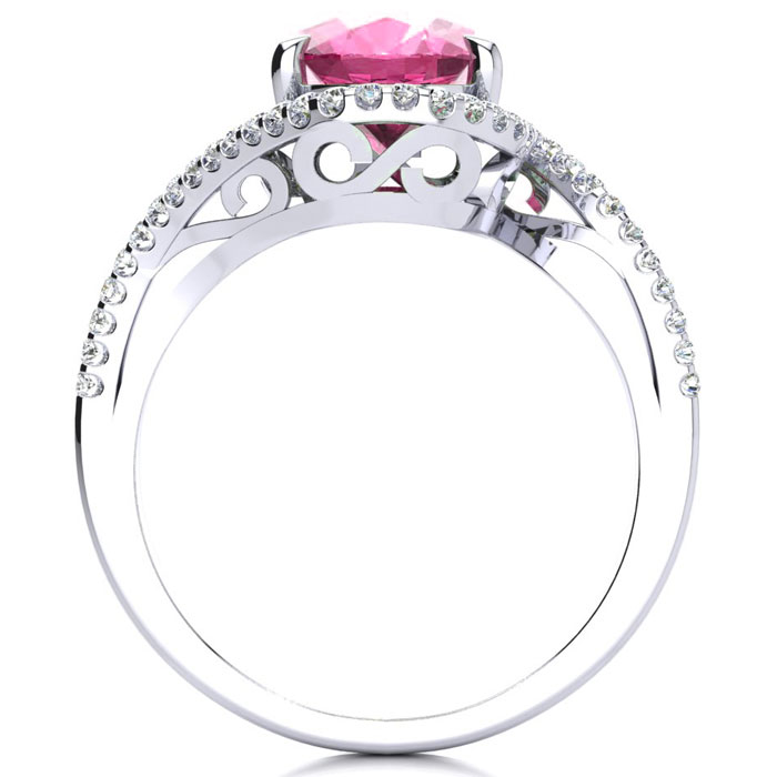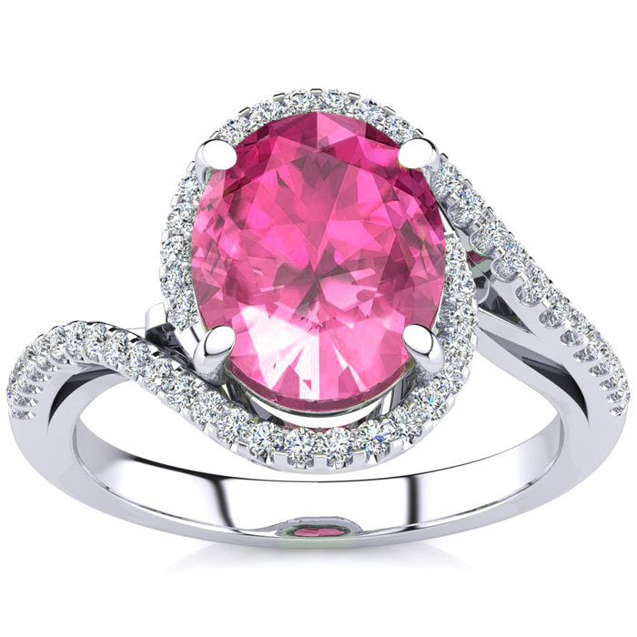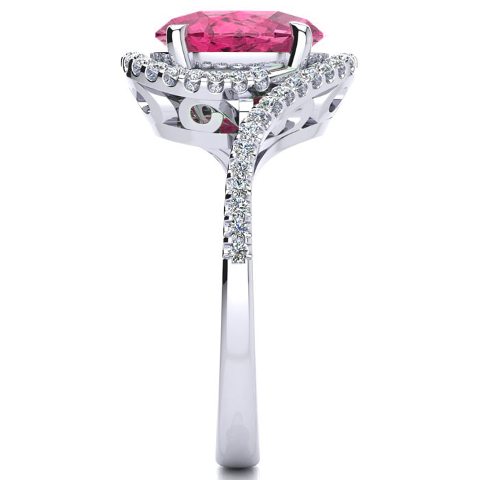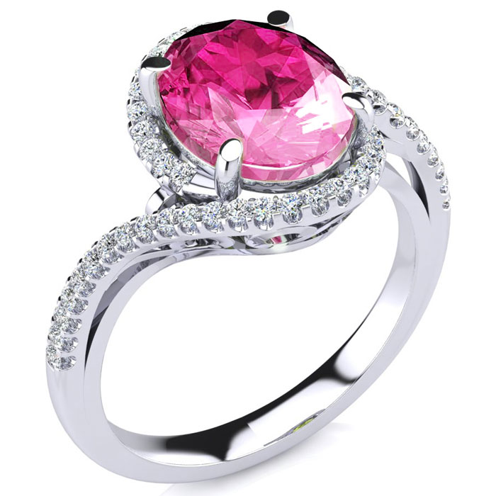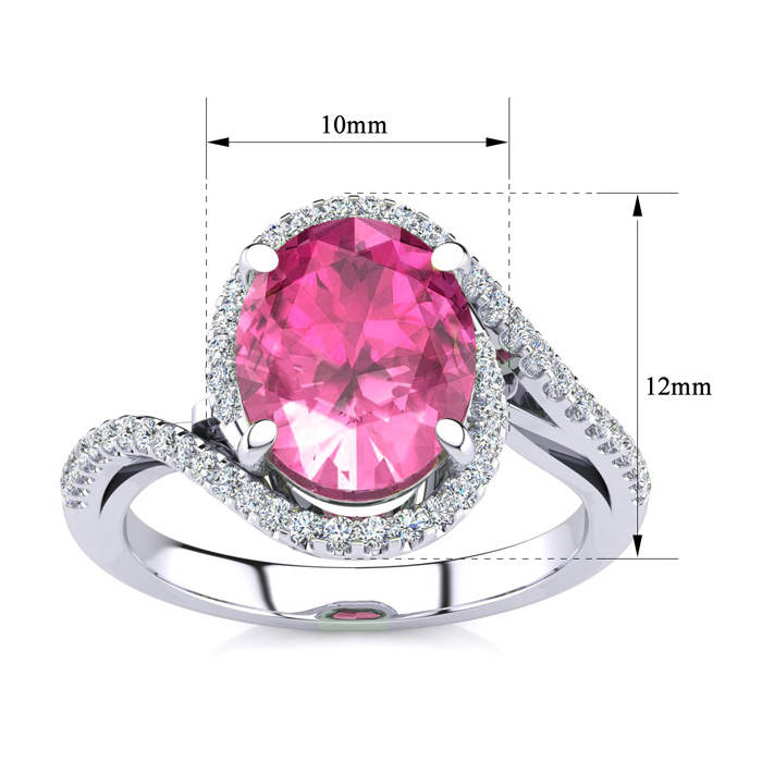 This pink sapphire ring features one 10x8mm oval shape created pink sapphire gemstone. It is surrounded by 50 sparkling diamonds totaling 1/4 carat in I-J color, I1-I2 clarity. Total carat weight is approximately 2 3/4 carats. This ring is in sterling silver.