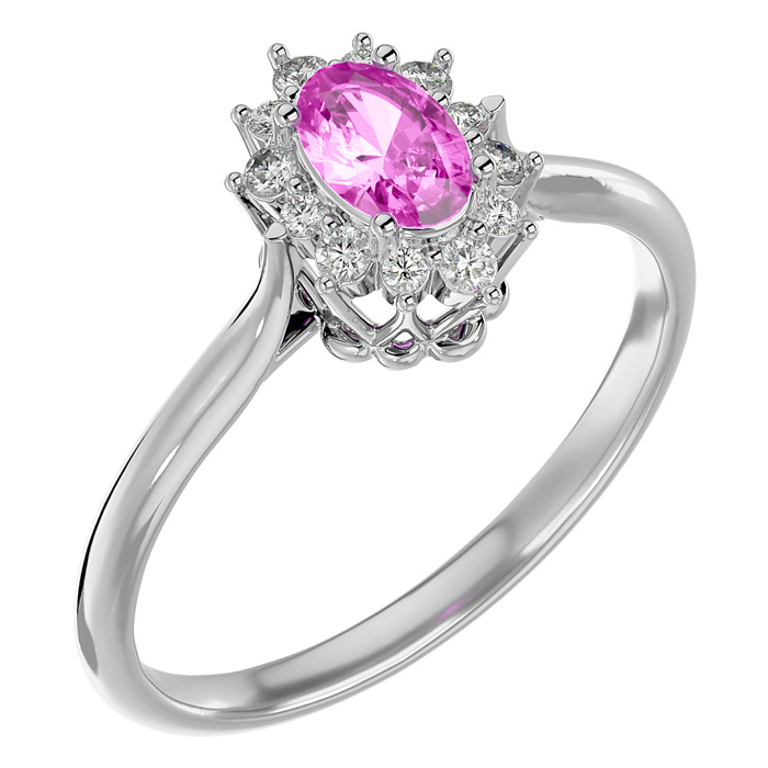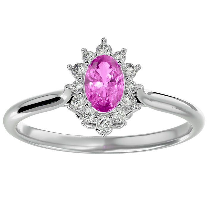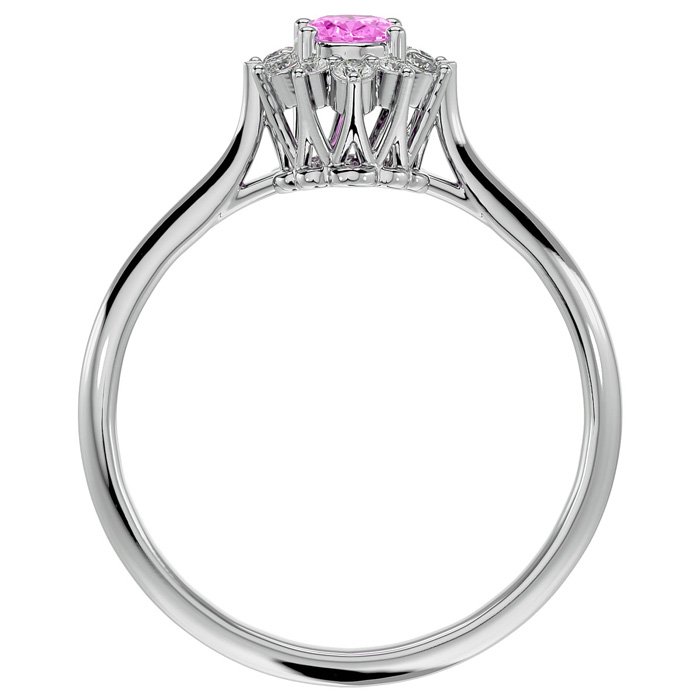 This pink sapphire ring features one 6x4mm oval shape created pink sapphire gemstone. It is surrounded by 12 sparkling diamonds totaling 0.15 carats in I-J color, I1-I2 clarity. Total carat weight is approximately 2/3 carat. This ring is in sterling silver.