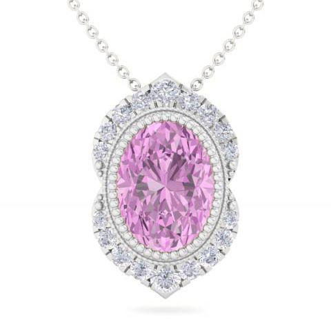 1 3/4 Carat Oval Shape Pink Topaz and Diamond Necklace In 14K White Gold