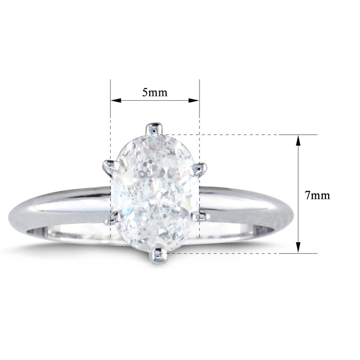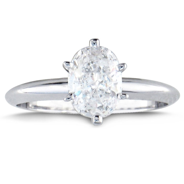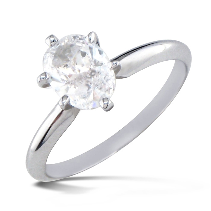 This classic solitaire ring features a 1 carat oval shape diamond in H-I color, I2 clarity. This is a low priced 1 carat oval diamond ring, so don't be surprised that the diamond is a little foggy! This ring is in solid 14 karat white gold™.