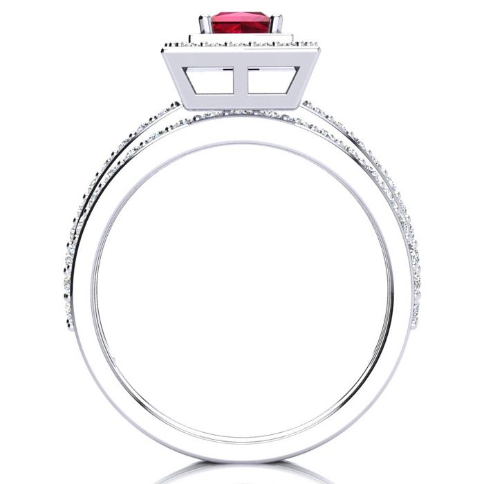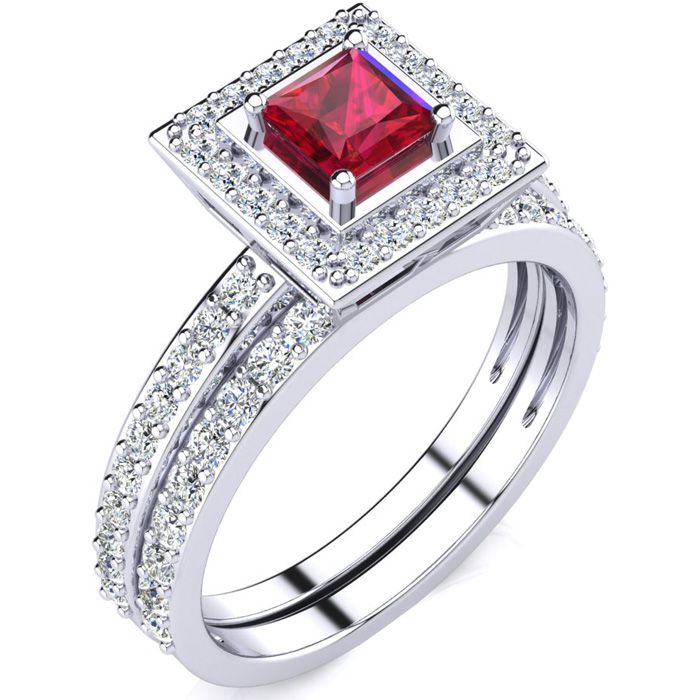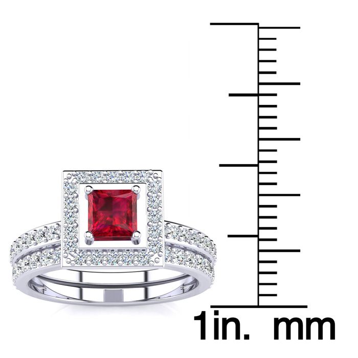 1ct Princess Cut Ruby and Natural Diamond Bridal Set in 14k White Gold