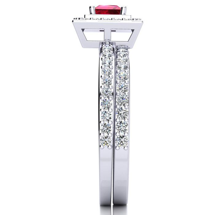 Estate Jewelry 1ct Princess Cut Ruby and Natural Diamond Bridal Set in 14k White Gold, Size 8