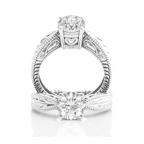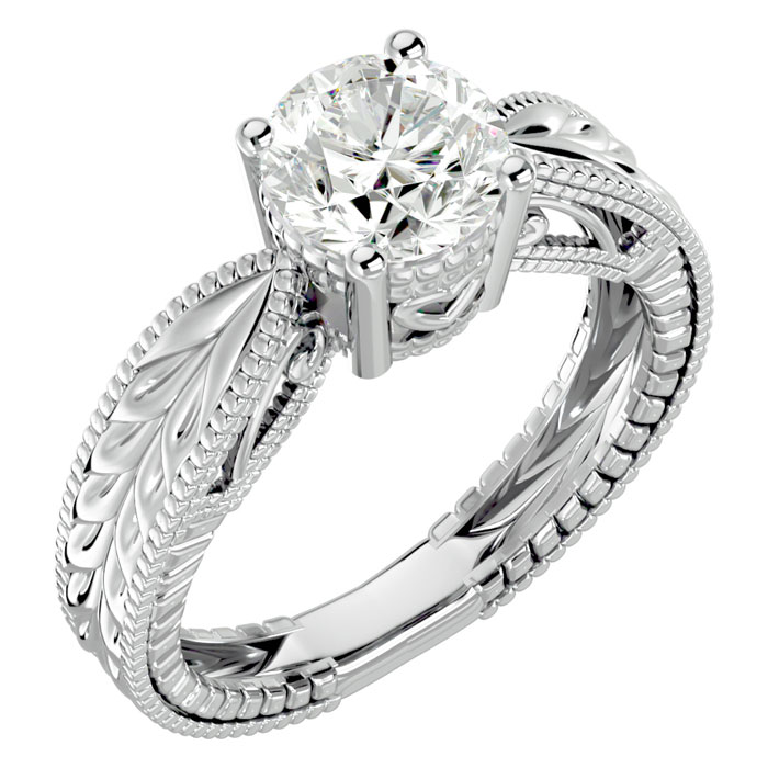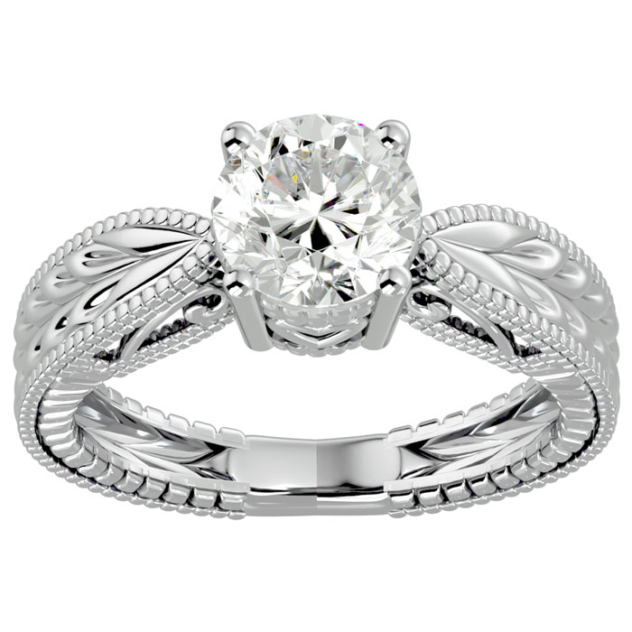 1 1/2 Carat Natural Diamond Round Engagement Rings In 14K White Gold With Tapered Etched Band