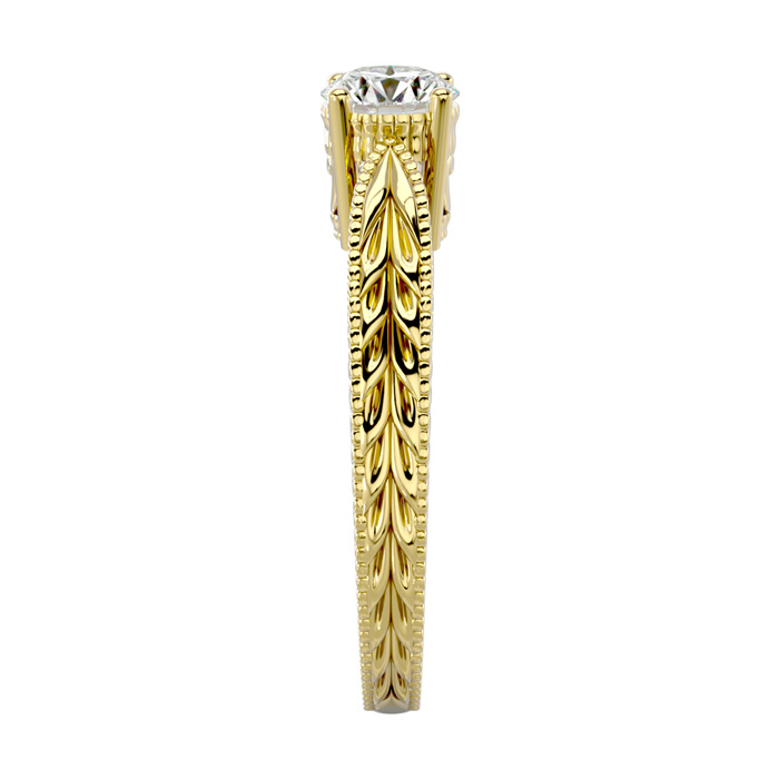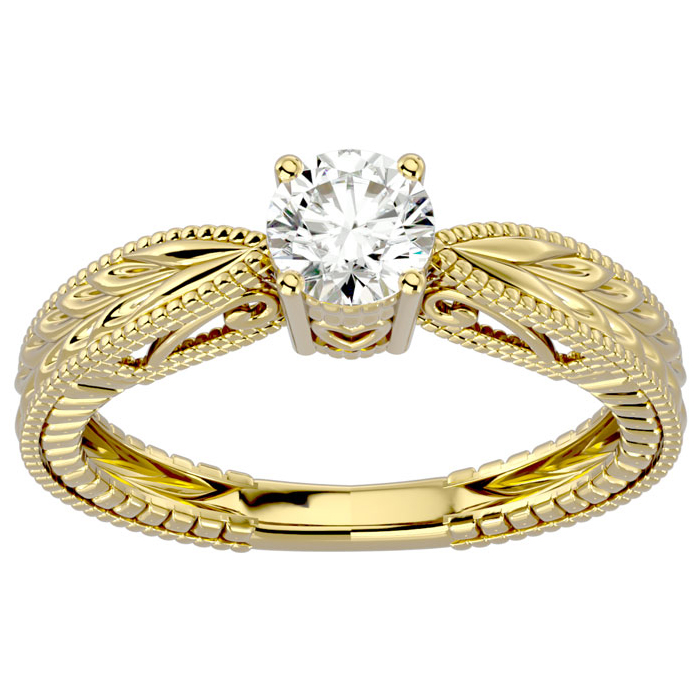 1/2 Carat Natural Diamond Round Engagement Rings with Tapered Etched Band In 14 Karat Yellow Gold