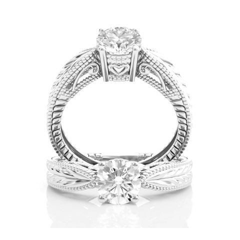 This is not just your average plain jane style solitaire engagemnt ring, it has a vintage flare with the ornate carving and intricate metal work, I especially love how the stone is set and the band tapes in to really feature the stone! This would make any woman's heart melt!!