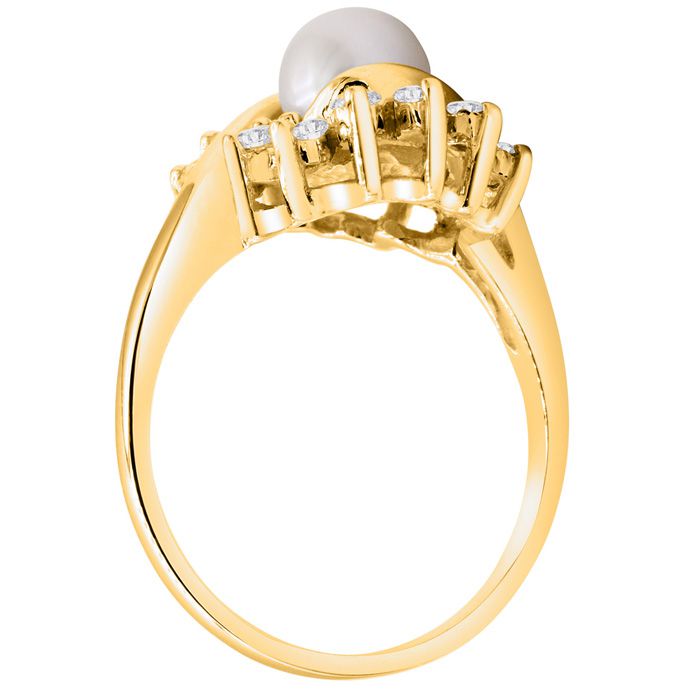 This ring features one 6mm freshwater cultured pearl. It has 10 diamond accents in a halo in I-J color, I2-I3 clarity at 0.50 carats total. This ring is in 14 karat yellow gold.