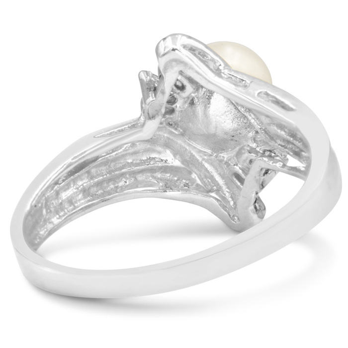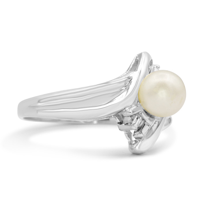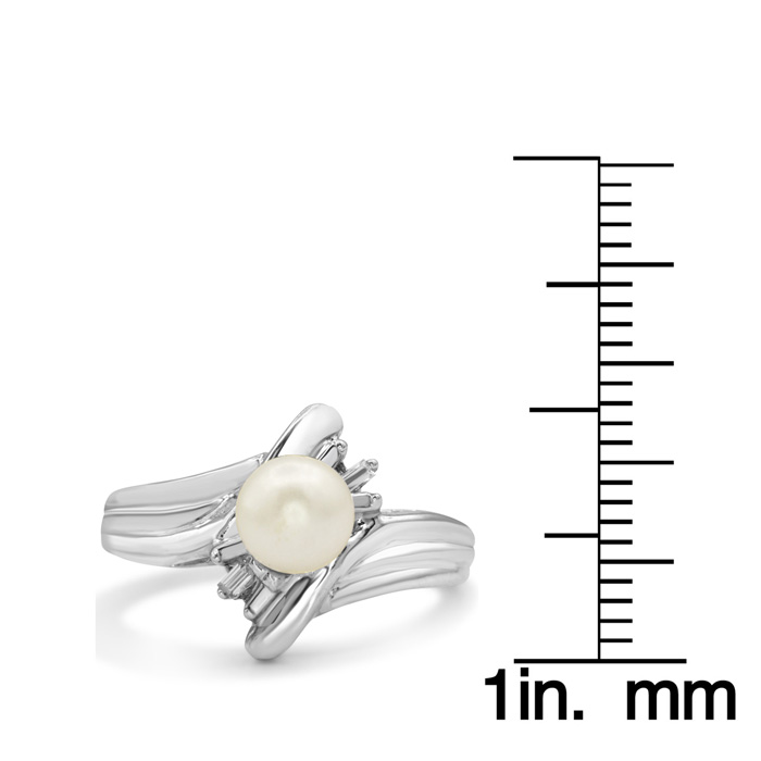 This ring features one 6mm freshwater cultured pearl. It has two baguette diamonds in I-J color, I2-I3 clarity at 0.04 carats total. This ring is in 14 karat white gold.