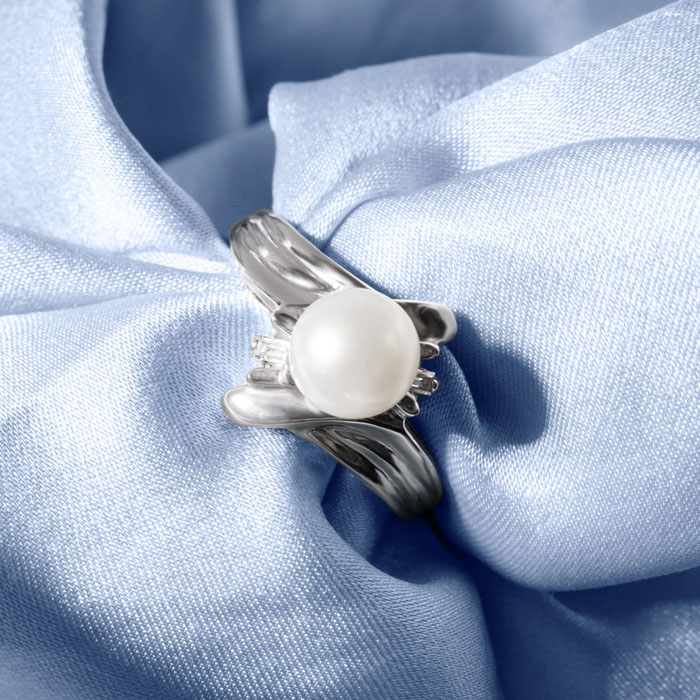 Round Freshwater Cultured Pearl and Baguette Diamond Ring In 14 Karat White Gold