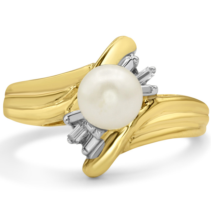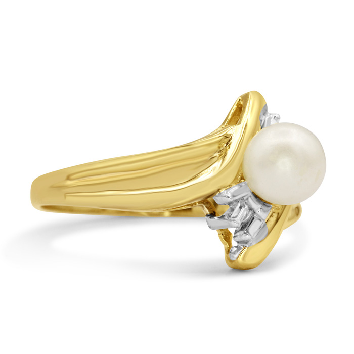 This ring features one 6mm freshwater cultured pearl. It has two baguette diamonds in I-J color, I2-I3 clarity at 0.04 carats total. This ring is in 14 karat yellow gold.