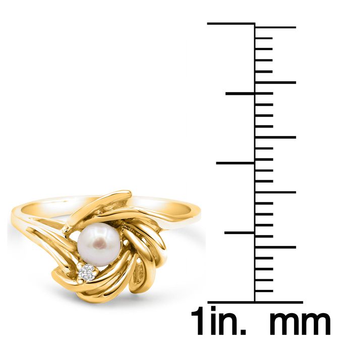 This ring features one 4mm freshwater cultured pearl. It has two diamond accents in I-J color, I2-I3 clarity at 0.02 carats total. This ring is in 14 karat yellow gold.