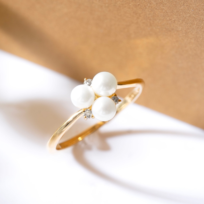 This ring features three 4mm freshwater cultured pearls. It has 3 diamond accents in I-J color, I2-I3 clarity at 0.06 carats total. This ring is in 14 karat yellow gold. *Retrograde Birthstones™ flips the idea of traditional birthstones. Wear your ½ birthday birthstone, your Retrograde Birthstone, “The Birthstone For Your Bad Side™.