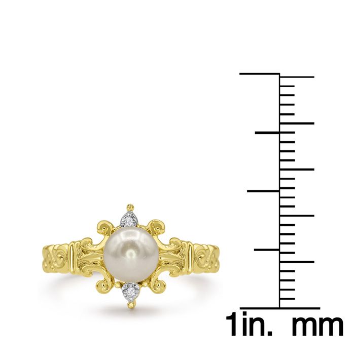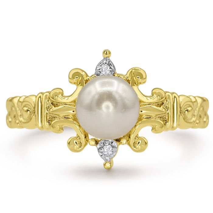 This ring features one 5.5mm freshwater cultured pearl. It has two diamond accents in I-J color, I2-I3 clarity at 0.01 carats total. This ring is in 14 karat yellow gold.