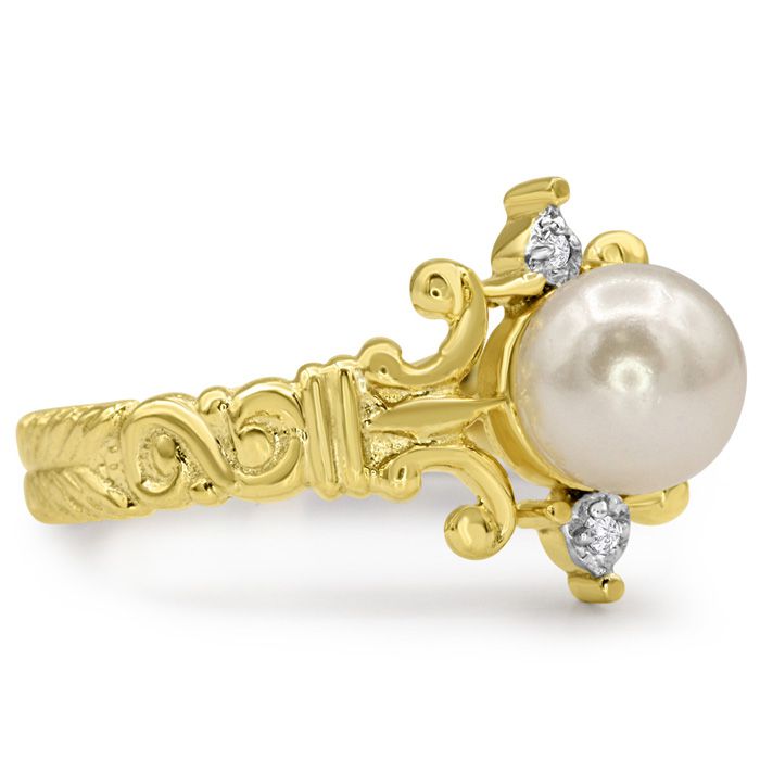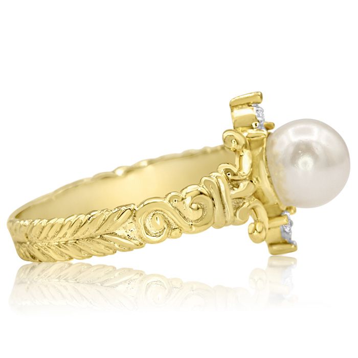 This ring features one 5.5mm freshwater cultured pearl. It has two diamond accents in I-J color, I2-I3 clarity at 0.01 carats total. This ring is in 14 karat yellow gold.